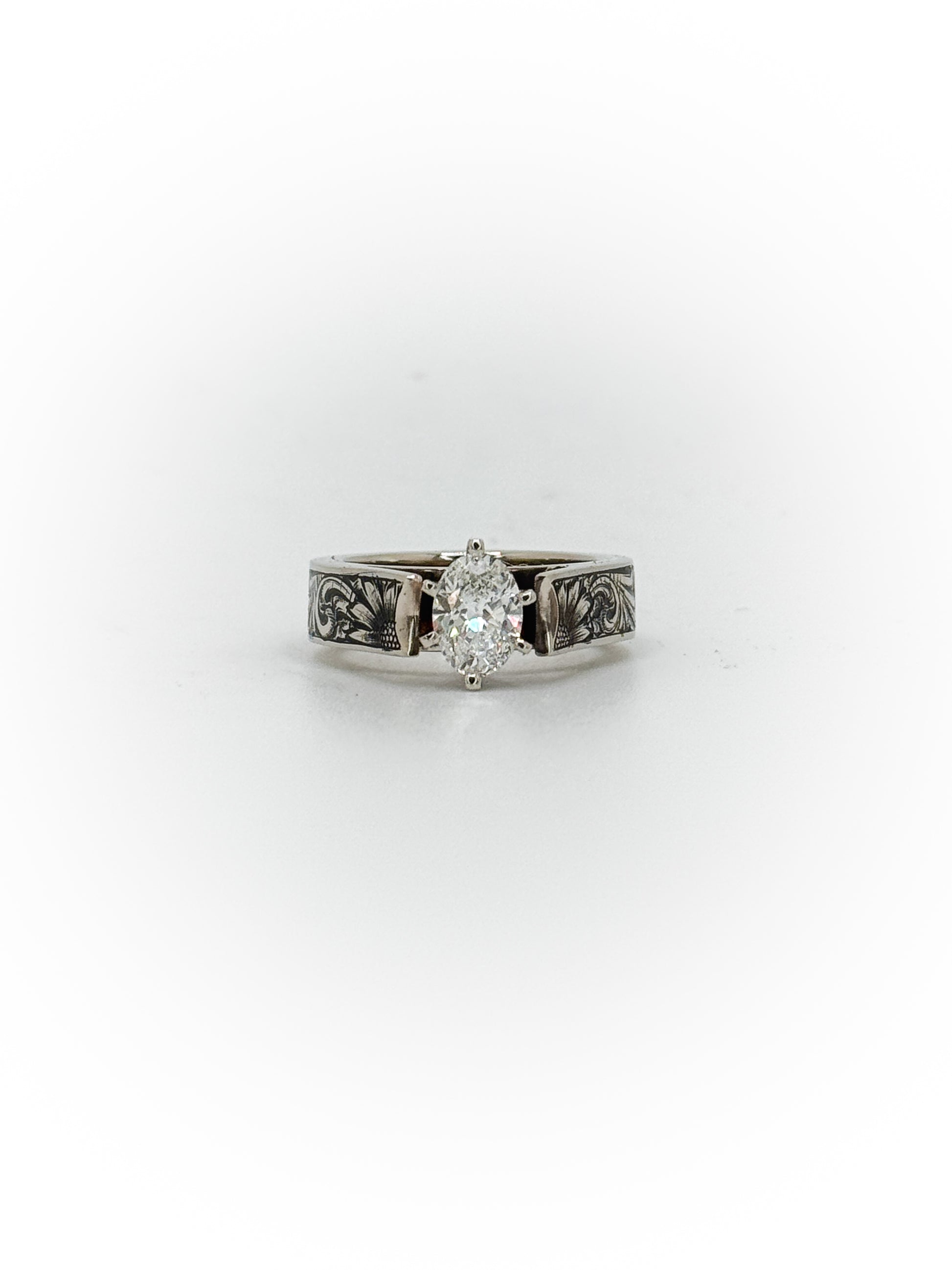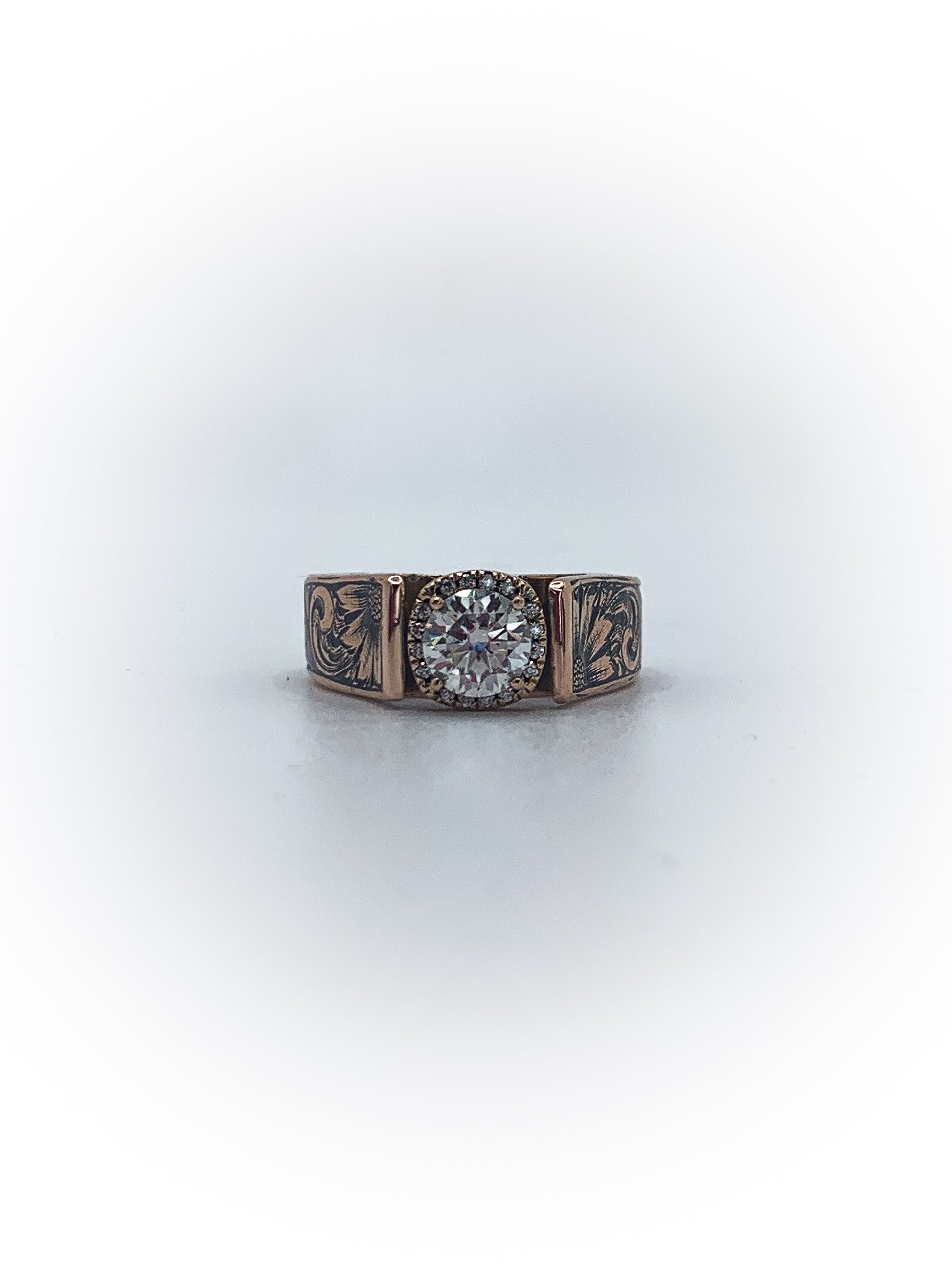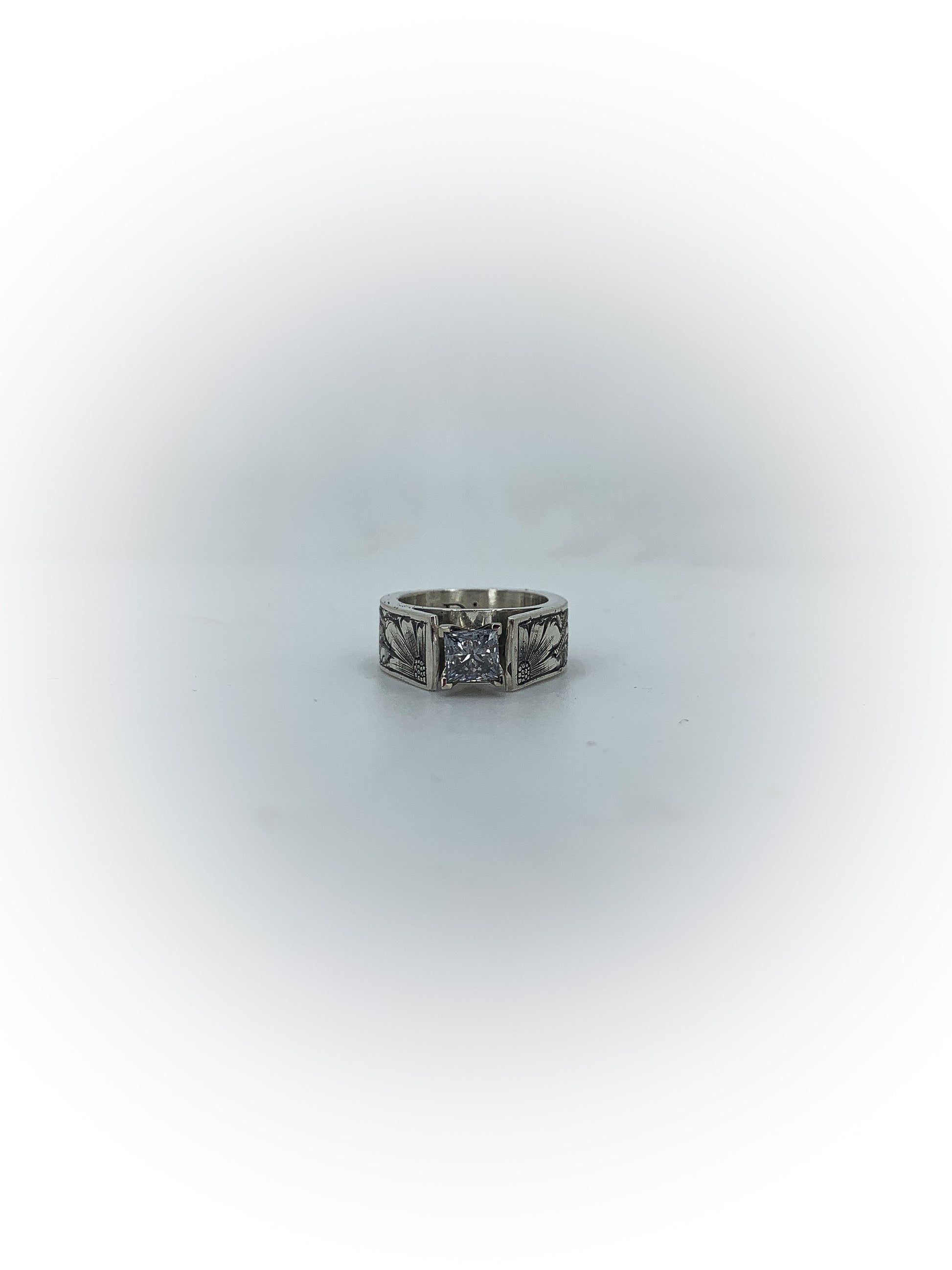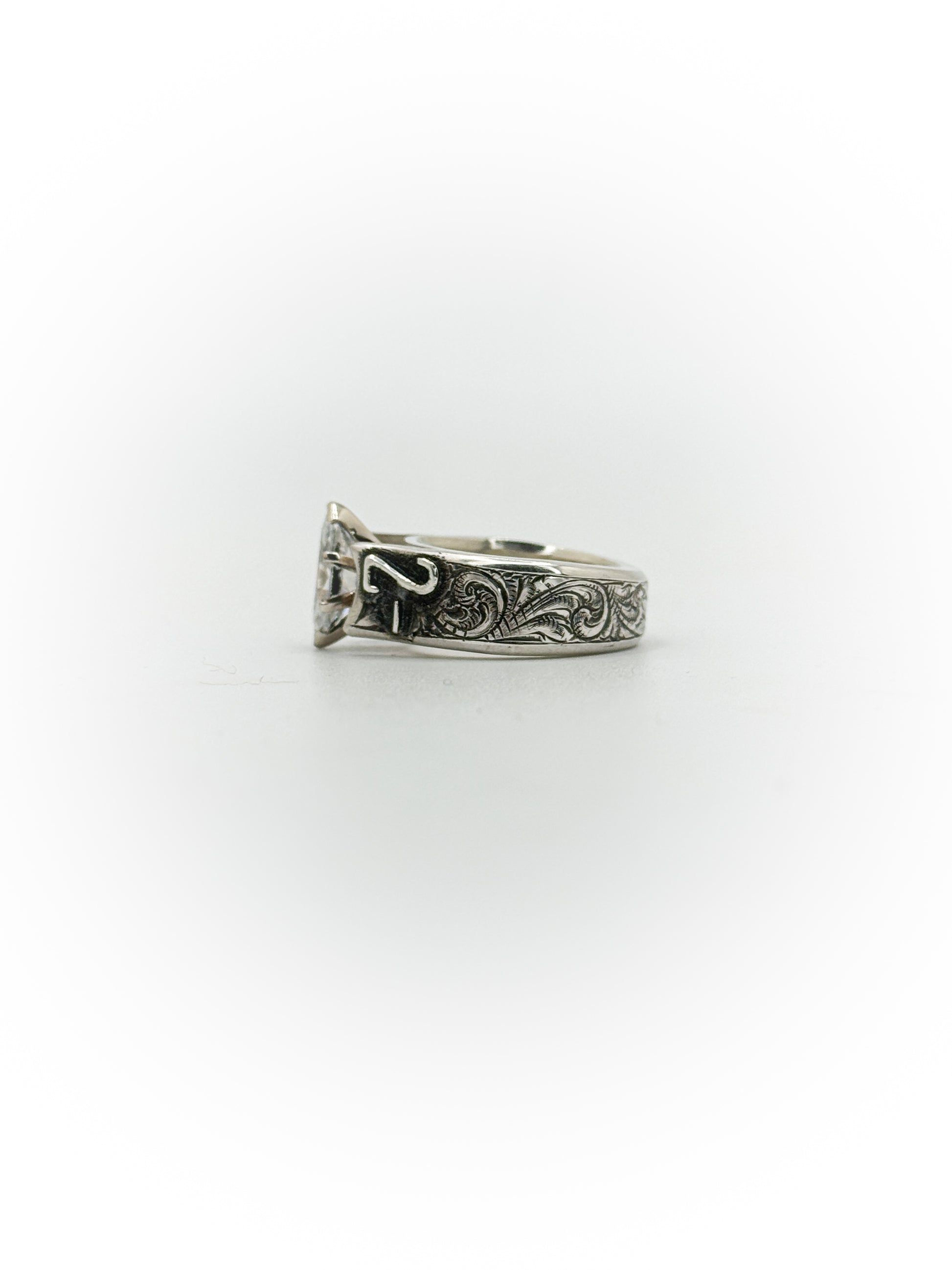Raised and ready — this cathedral setting lifts the stone with intention, framed by hand-engraved detail that runs the length of the band. Bold without being loud. Traditional without losing its edge.
