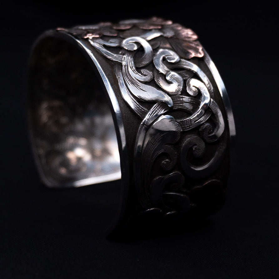 This sterling silver cuff features stacked sterling overlay scrollwork with copper flower accents, all cut and laid by hand. The back side is fully bright cut engraved, making it just as bold on the inside as it is up front.