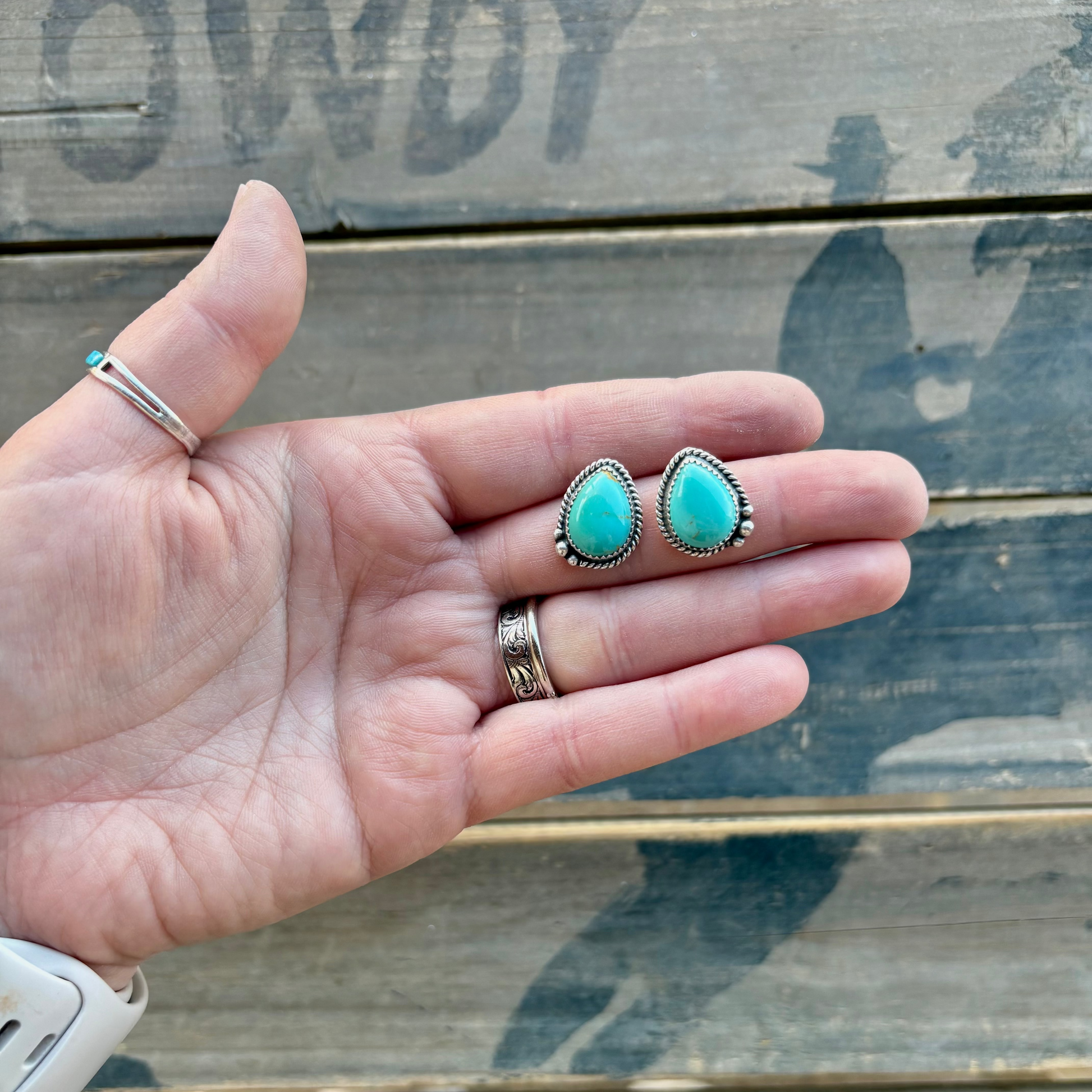 These Kingman turquoise earrings are such a sweet, easy pair. I set them in sterling silver with a twisted rope border and little silver accents. They measure about .7" x .5".