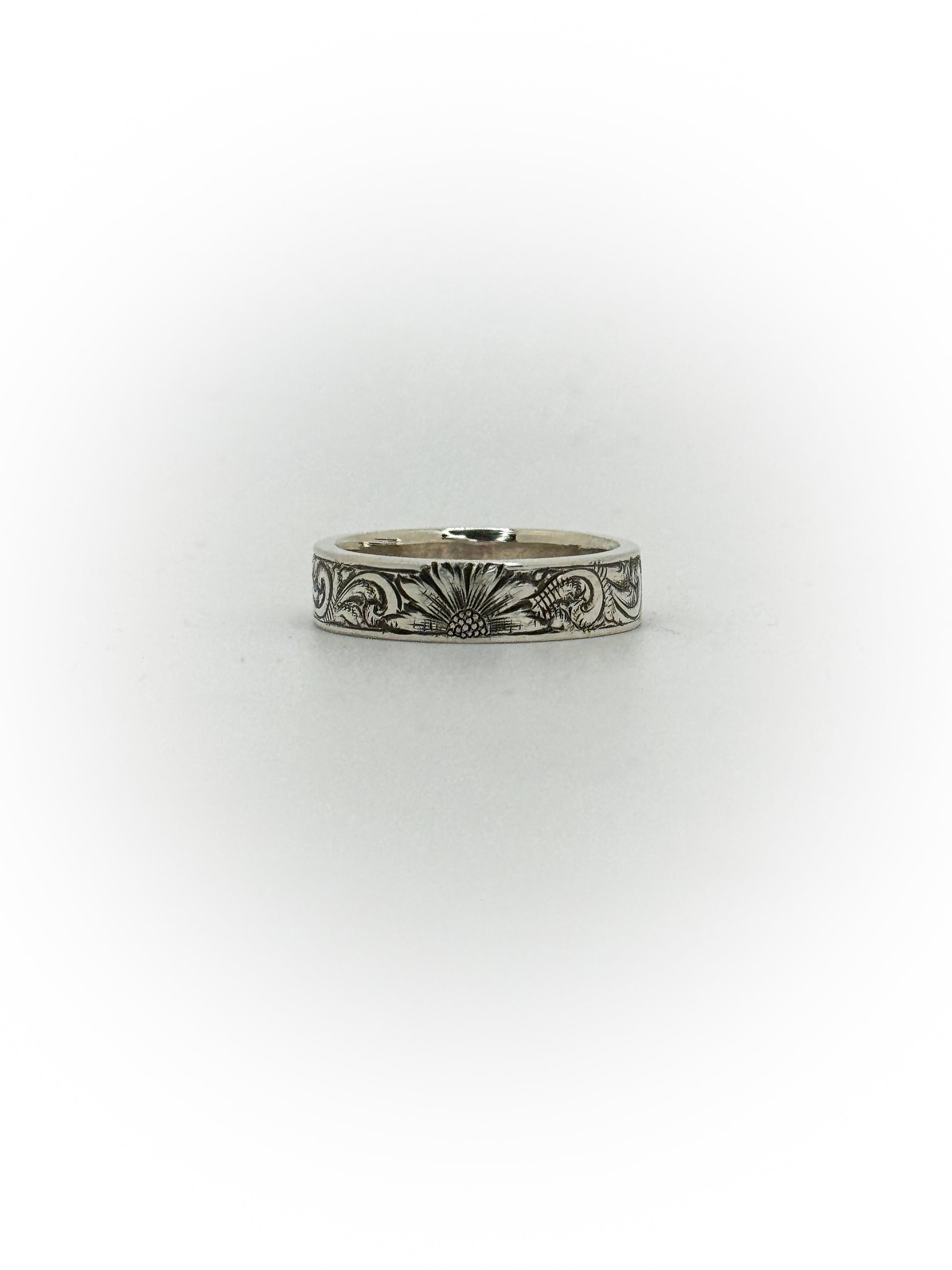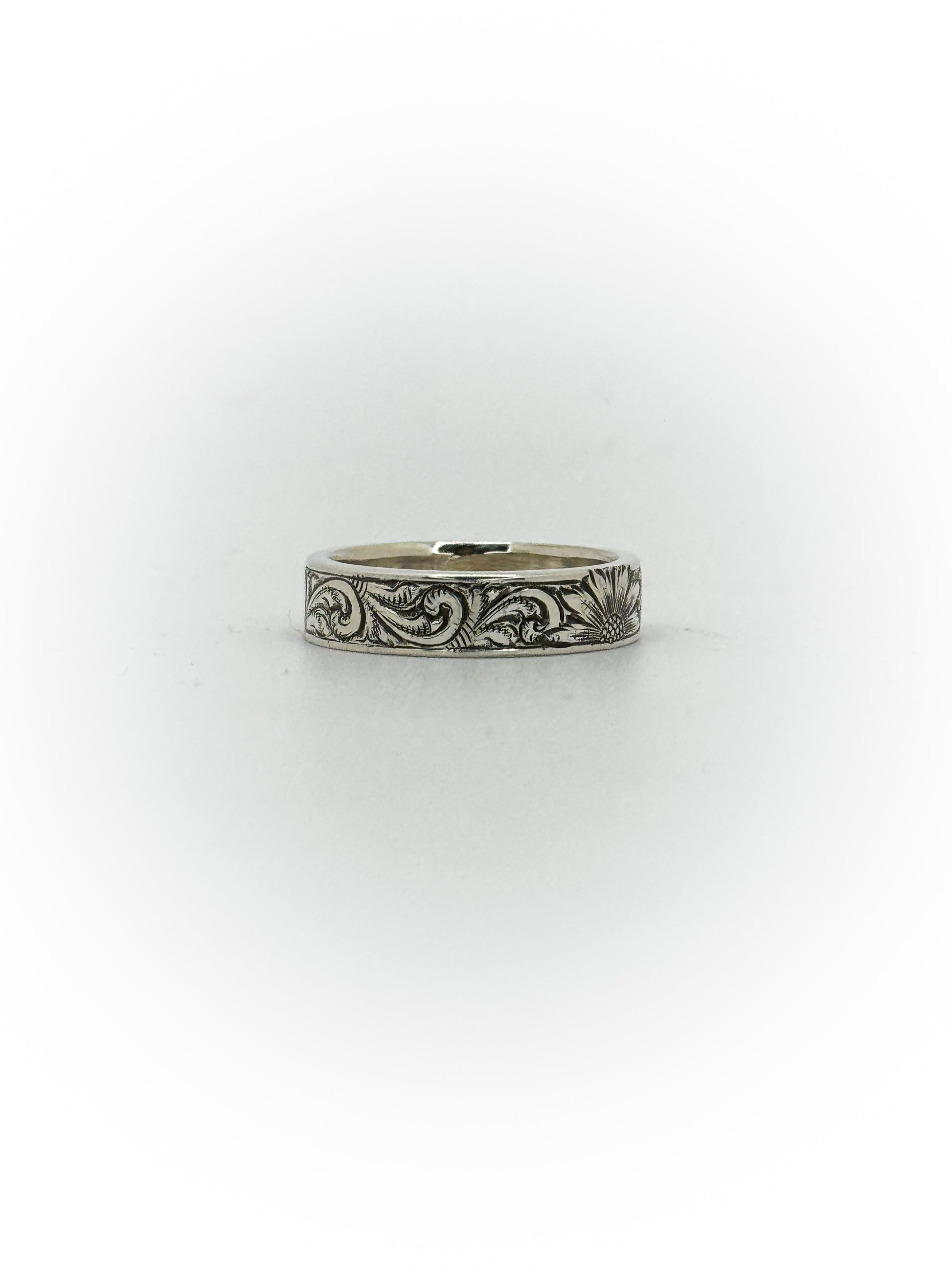 Built from solid sterling silver and hand engraved with classic scrollwork — no machines, no shortcuts. The 5mm wide band keeps a lower profile while still carrying the detail.